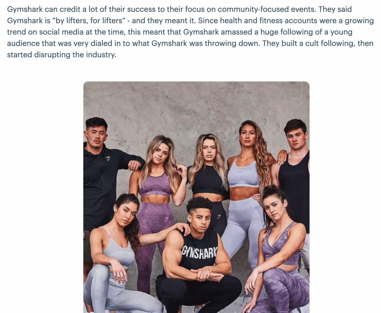 Influencer Marketing: Gymshark’s growth was significantly boosted by leveraging fitness influencers on social media. By sending free products to popular YouTubers and Instagram fitness influencers, the brand quickly gained visibility.